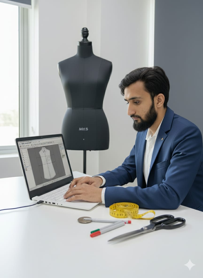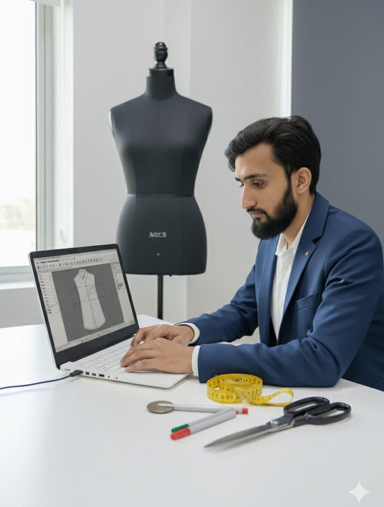 Welcome to my official website! I am Khubaib, a passionate pattern designer and garment technology expert currently working at Outfitters by Ethnic (Ombre Apparel Park) as a Senior Officer Pattern Maker and Designer. With over 5 years of professional experience and hands-on expertise in Garber software, garment sampling, and production planning, I am committed to setting trends in the Pakistani apparel industry.
